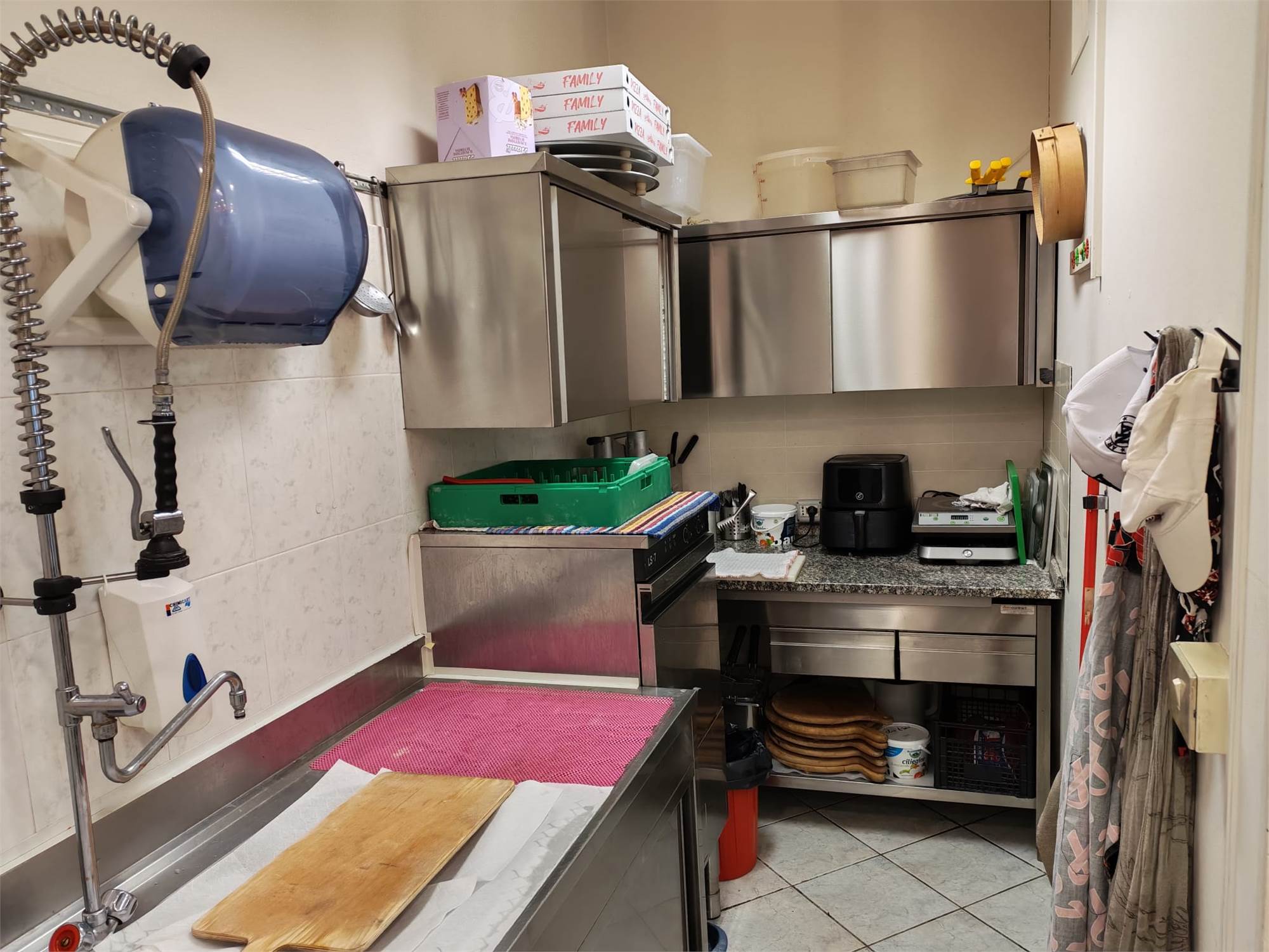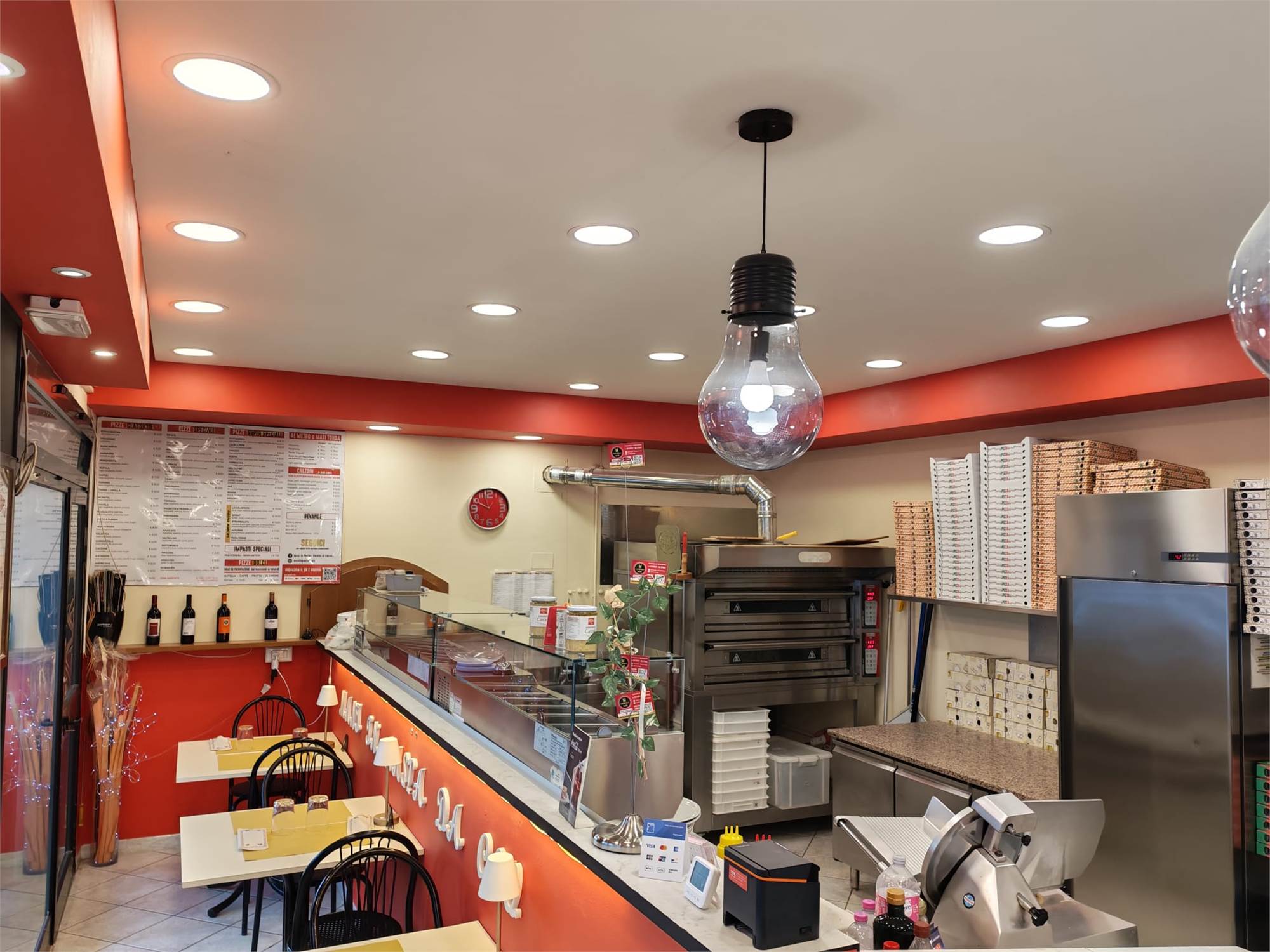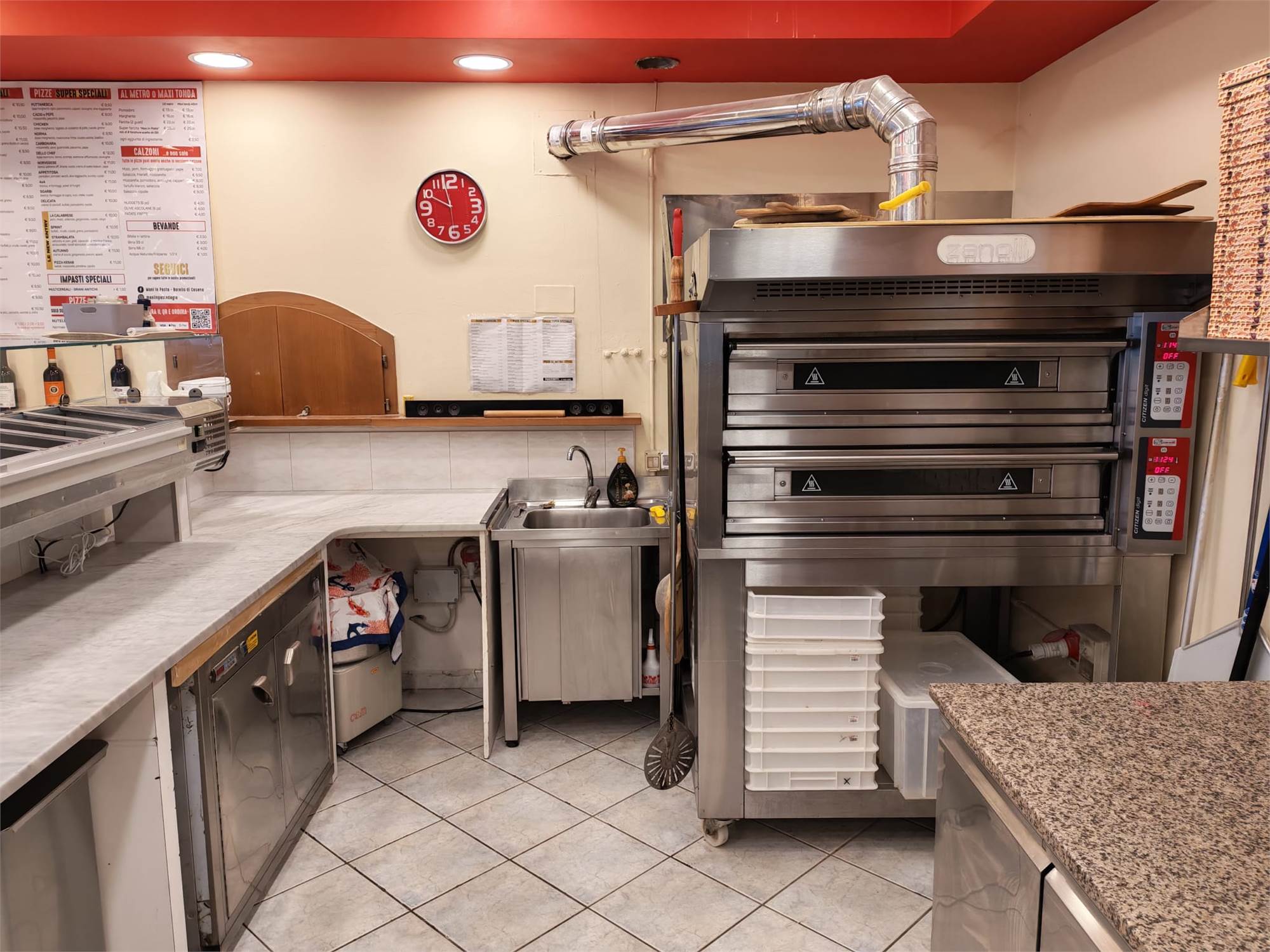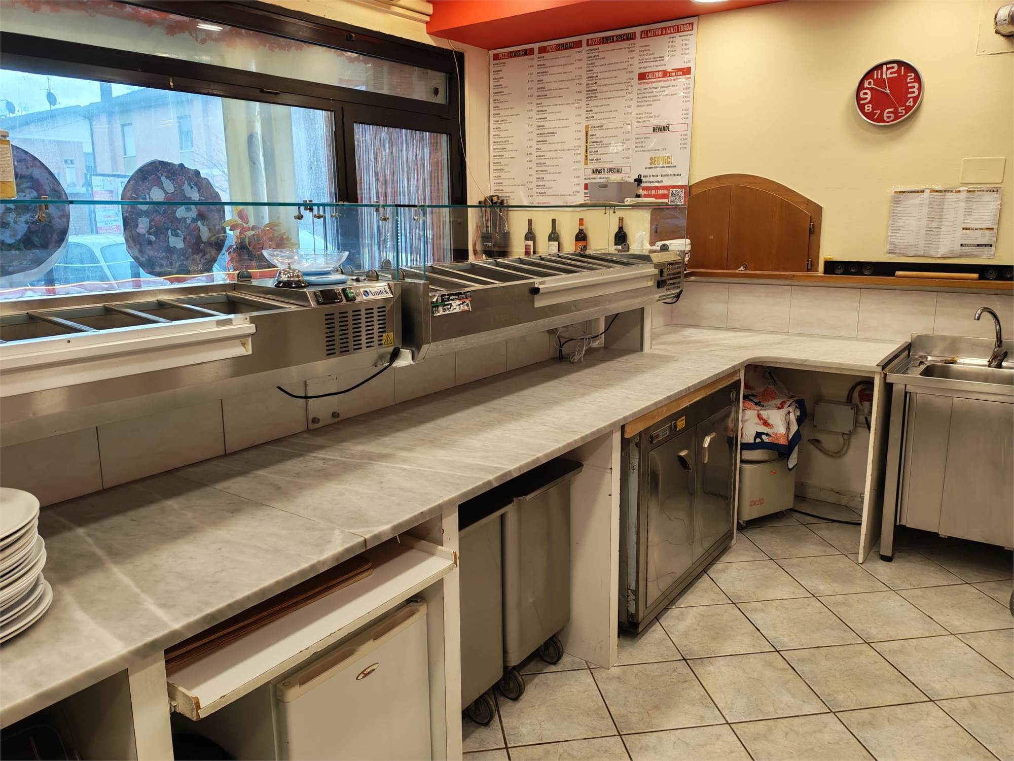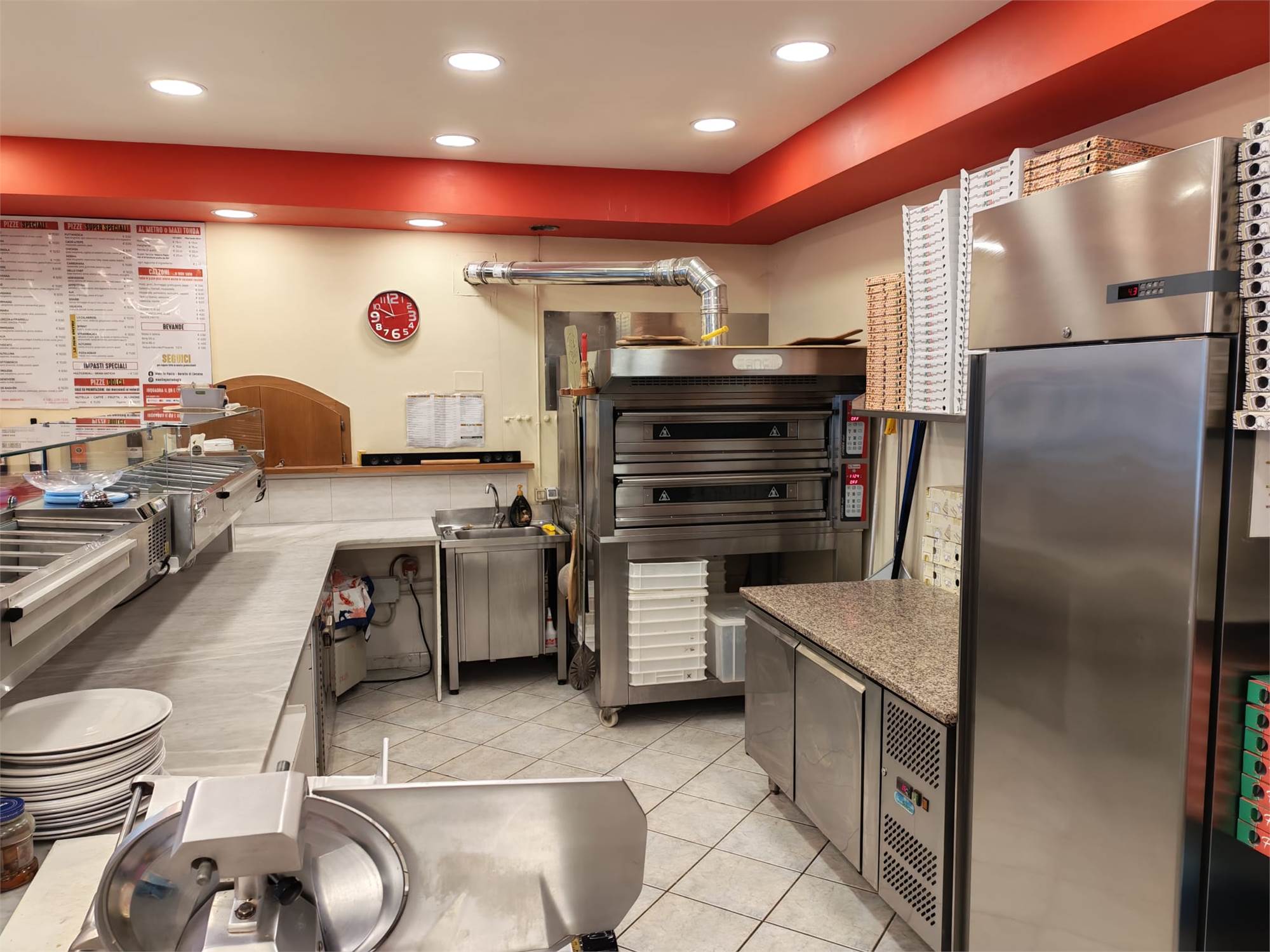 - Forno elettrico per 18 pizze, 3 Friggitrici, macchina per Kebab, 5 frigoriferi, 2 vetrine console per alimenti, cucina a 2 fuochi, 2 piastre induzione, bollitore induzione, 2 cappe aspiratrici, lavastoviglie, affettatrice;